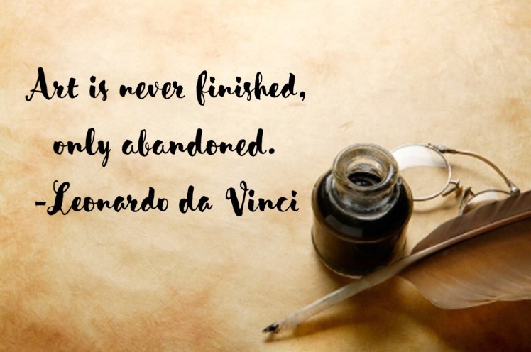 However, that said, I’m still incredibly motivated to complete this project of 12 months of stories and I’m enjoying finishing stories. Although, I will say (and maybe others who write or do some kind of art or something can agree) I feel like something I write is never finished. <Record scratch> “What? Isn’t finishing a short story every month the whole point of this blog?” you ask. Yes. And I am finishing the stories I write each month and talk about on this blog; but what I’m saying is with something I create I feel like I can always be tweaking them. At the risk of sounding and looking pretentious, here’s a good quote from Leonardo da Vinci about art that I think applies to all forms of art, including the written word.