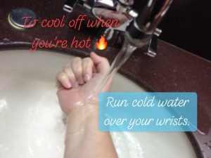To cool off when you’re hot, run cold water over your wrists. This was one my Mom always used to tell me but on further research it looks like it’s actually based in science. You’re cooling off your pulse points (another pulse point is the back of your knees).