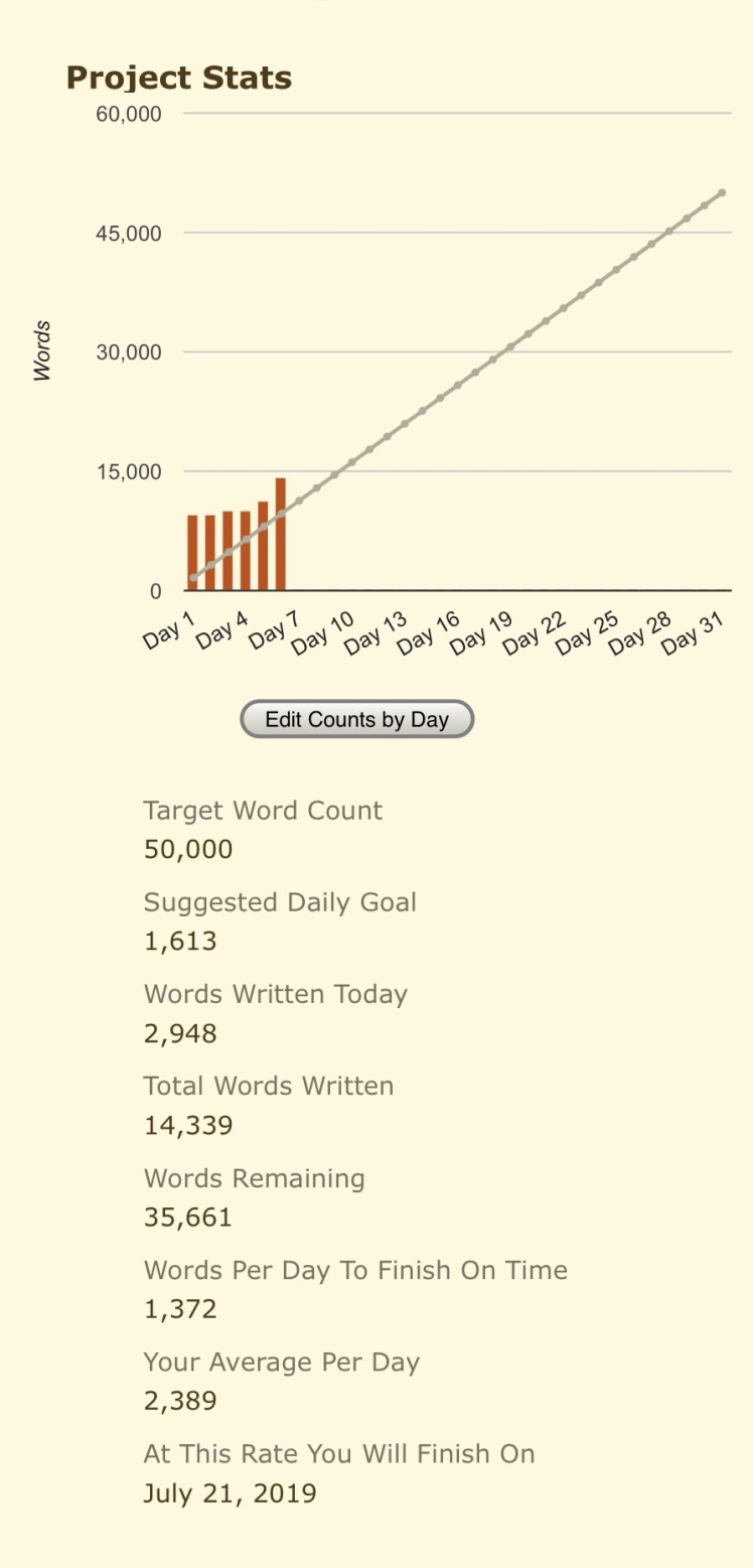 My word count: 14,339. Just 35,661 to go until my goal of 50,000 words.