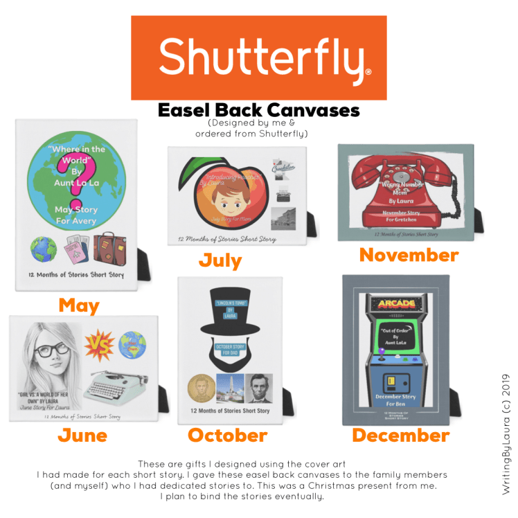 My initial goal in concluding the project was to bind the stories together for myself and do individual ones for my family of the stories they inspired for Christmas 2018. I still haven’t done this as I wanted to edit the stories a bit more. After I finish my memoir rough draft I will do this. Instead of giving my family bound copies of the short stories they inspired for Christmas I designed little “Easel Back Canvases” from Shutterfly with the story artwork and gave them those. They turned out pretty cute (see below).