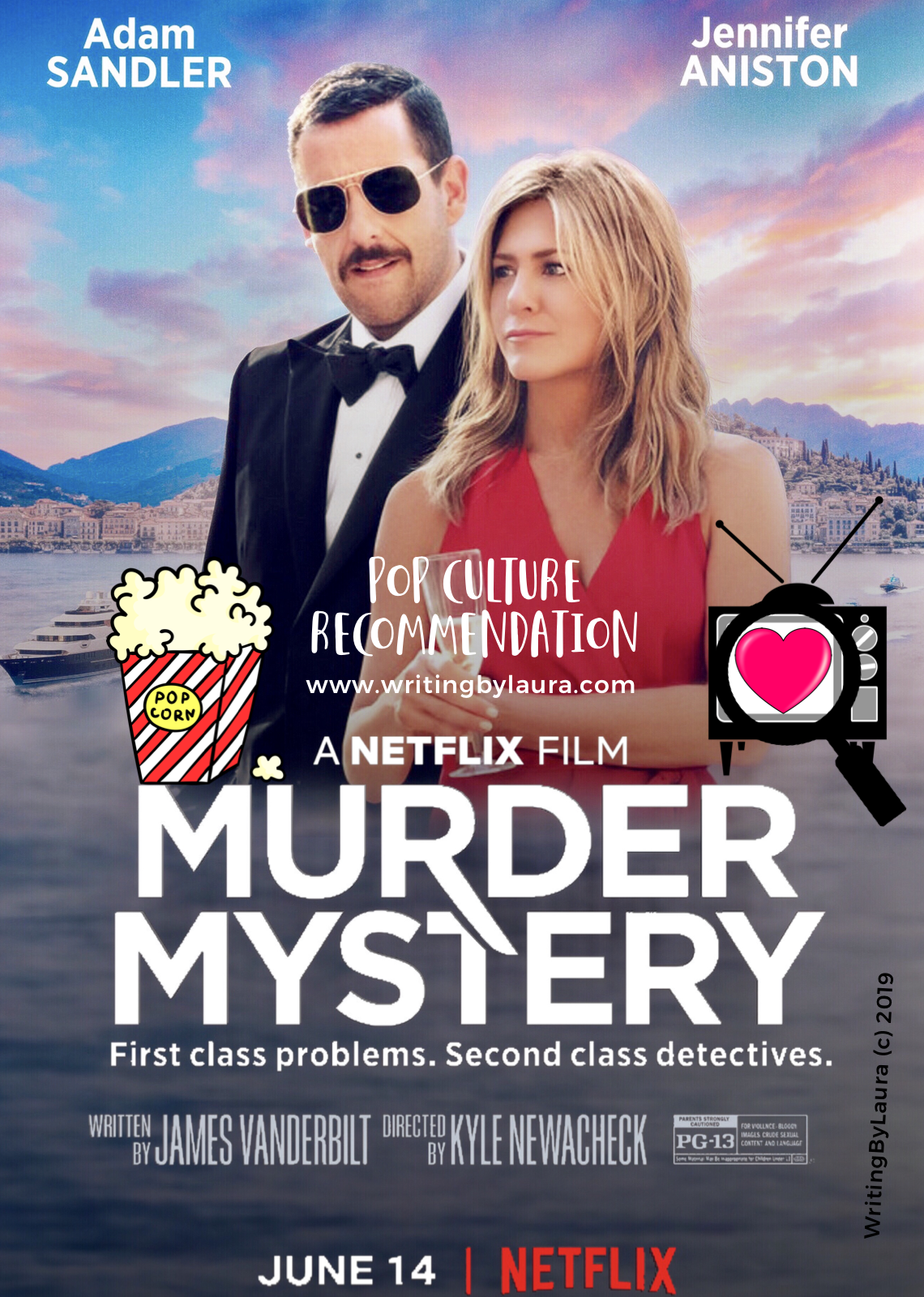On a recent Friday night we ordered pizza from a favorite local restaurant and I picked out the movie. I didn’t ask for input or anything. I just knew they’d like it. So we watched “Murder Mystery” a Netflix original movie starring Jennifer Aniston and Adam Sandler. It was a fun and light and silly watch. Perfect for our Friday night. In addition to discussing “Murder Mystery”. I will also mention a few bits of pop culture on the horizon for watching (with my parents).