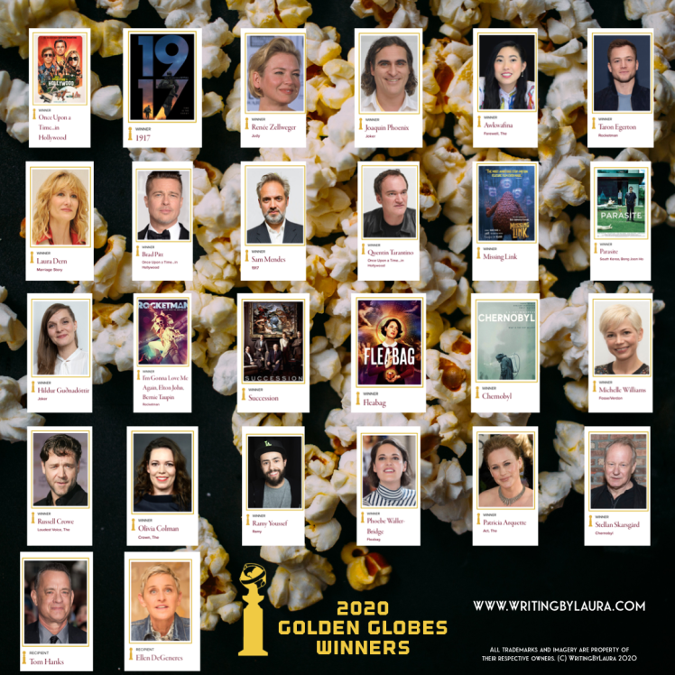Since the Golden Globes aired last night (Sunday, January 5, 2020) I thought I’d post a reflection on the winners as well as an updated ballot that highlights who won each award. As I said last week, I will do an Oscar ballot similar to this (but more detailed on where/how to watch the movies) once Oscar nominations are announced on January 13, 2020.