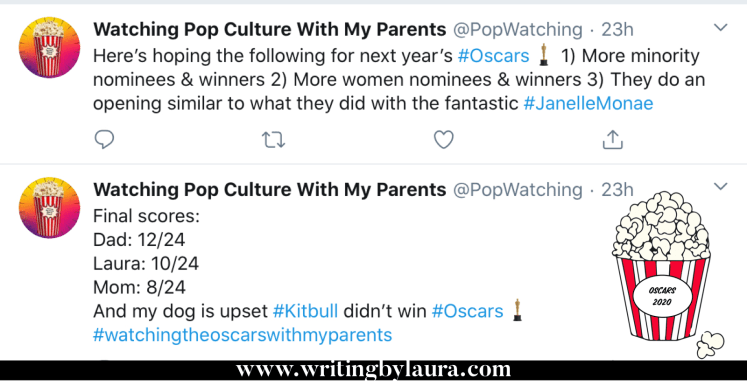 Since I had gone through the trouble of making an Oscar Ballot, my parents and I all chose our selections at breakfast Sunday morning so we were ready for the awards Sunday night. And then we watched the WHOLE show. I wore my popcorn socks (not made of popcorn but they have pictures of 🍿 on them) and pressured my Dad into making popcorn! I also live tweeted during the show on my @popwatching Twitter account with updates on how we were doing on our predictions. And sob 😢 I didn’t win. My Dad got 12/24, I got 10/24, and Mom got 8/24. Granted none of us did really great, but we had fun (and I created a hashtag: #watchingtheoscarswithmyparents).