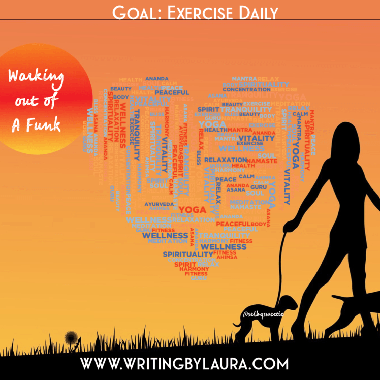 My question for myself is “how do I fight this funk?” To answer that I go back to the beginning of this blog post where I said I haven’t been actively working towards a goal. I have been wishy-washy about finishing my memoir. And while I think that’s still a goal to work on, I am going to focus on just one central goal. And I think when I achieve this goal more achievements will fall out of it. Here’s my new central goal: Daily Exercise!