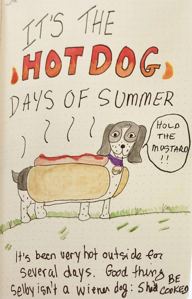 Since I just posted a few days ago (I talk about masks and give a book review), I have decided to not to do a regular TBI blog post. Instead, here is something silly I photoshopped inspired by a Daily Doodle that I did a few days ago. It has been so hot where I live that I am glad Selby isn’t a wiener dog 🌭 🐶 or else she’d be cooked! 😂