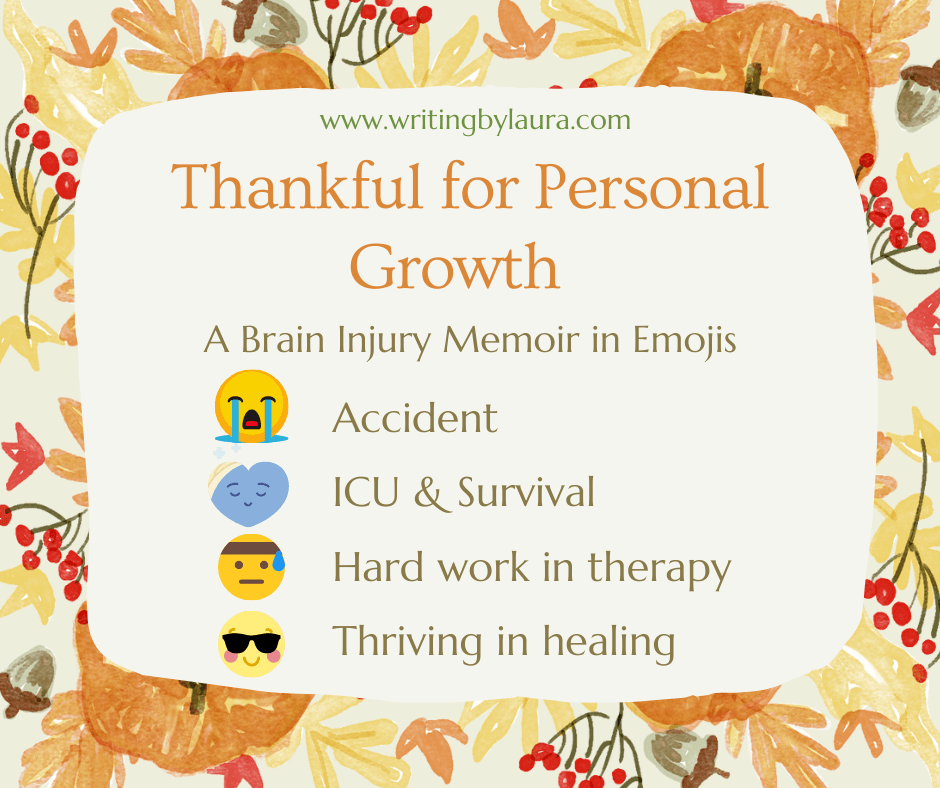 I realize how far I’ve come since the severe Traumatic Brain Injury (TBI) and coma I experienced as the result of a car accident 5 years ago the more I write about my experience in this blog and in my memoir. With reflection comes thankfully… a feeling of thankfulness. And since I’m not sitting at a dinner table with you telling you what I’m thankful for before we eat (an American Thanksgiving Tradition), I thought I would write about feeling thankful for personal growth.