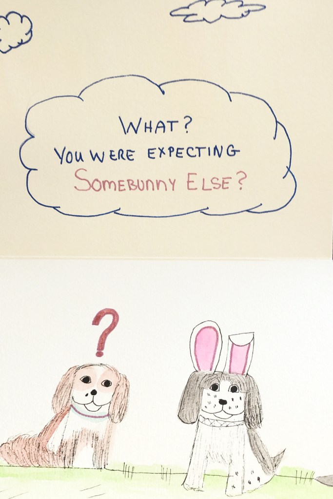 I thought of this and had to do it since it was silly and featured Selby (and that’s supposed to be a bunny). The tray sitting in front of the picture is filled with wooden eggs that I got on Amazon and painted last year.