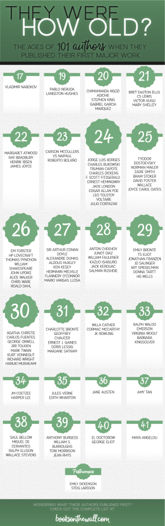 - They Were How Old? The Ages of 101 Famous Writers at First Publication: An article and infographic listing ages of authors at first publication. However, this only goes up to 41!!!!